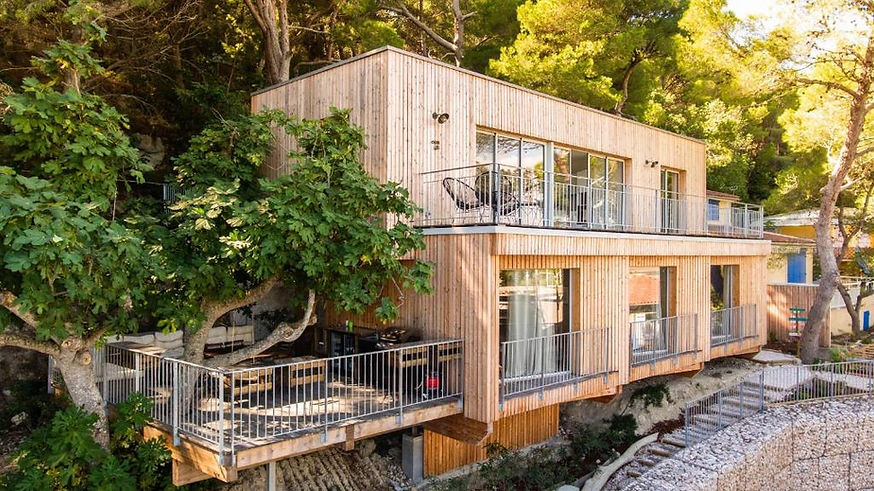 La maison se partage sur deux niveaux: 3 chambres avec balcon et salle d'eau privative au rez-de-chaussée et une pièce à vivre ouvrant sur une terrasse vue mer, une suite parentale et deux chambres avec une salle de bain au niveau supérieur.